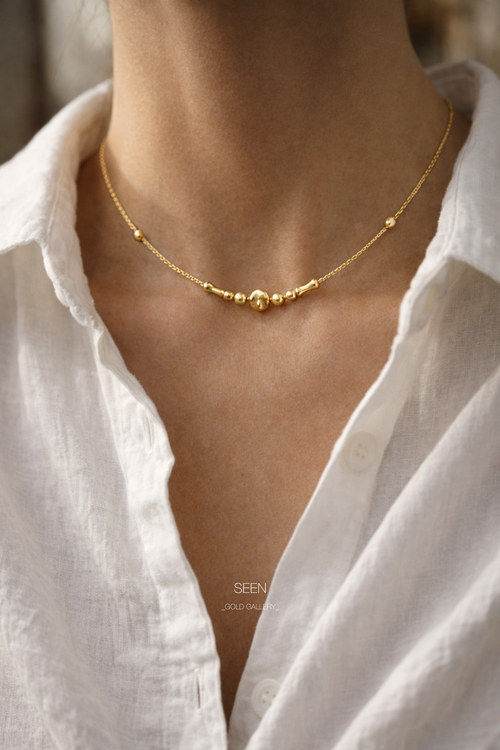 این گردنبند طلا مینیمال با ترکیب گویهای ظریف و المان استخوانیشکل، طراحی متفاوت و مدرنی را به نمایش میگذارد. توازن بین فرمهای ساده و کشیده، جلوهای شیک و امروزی ایجاد کرده که بهراحتی با استایلهای روزمره و مینیمال هماهنگ میشود.