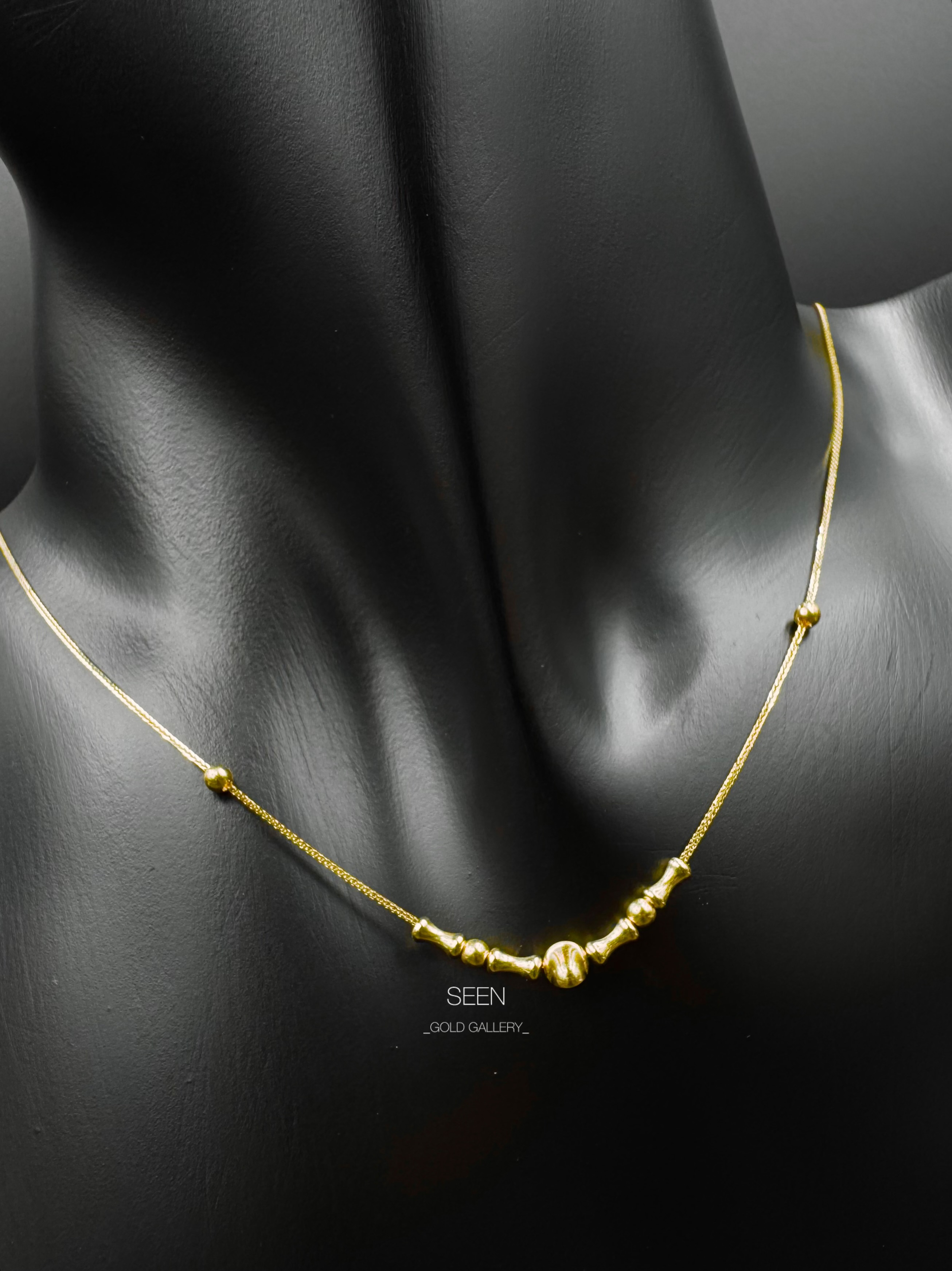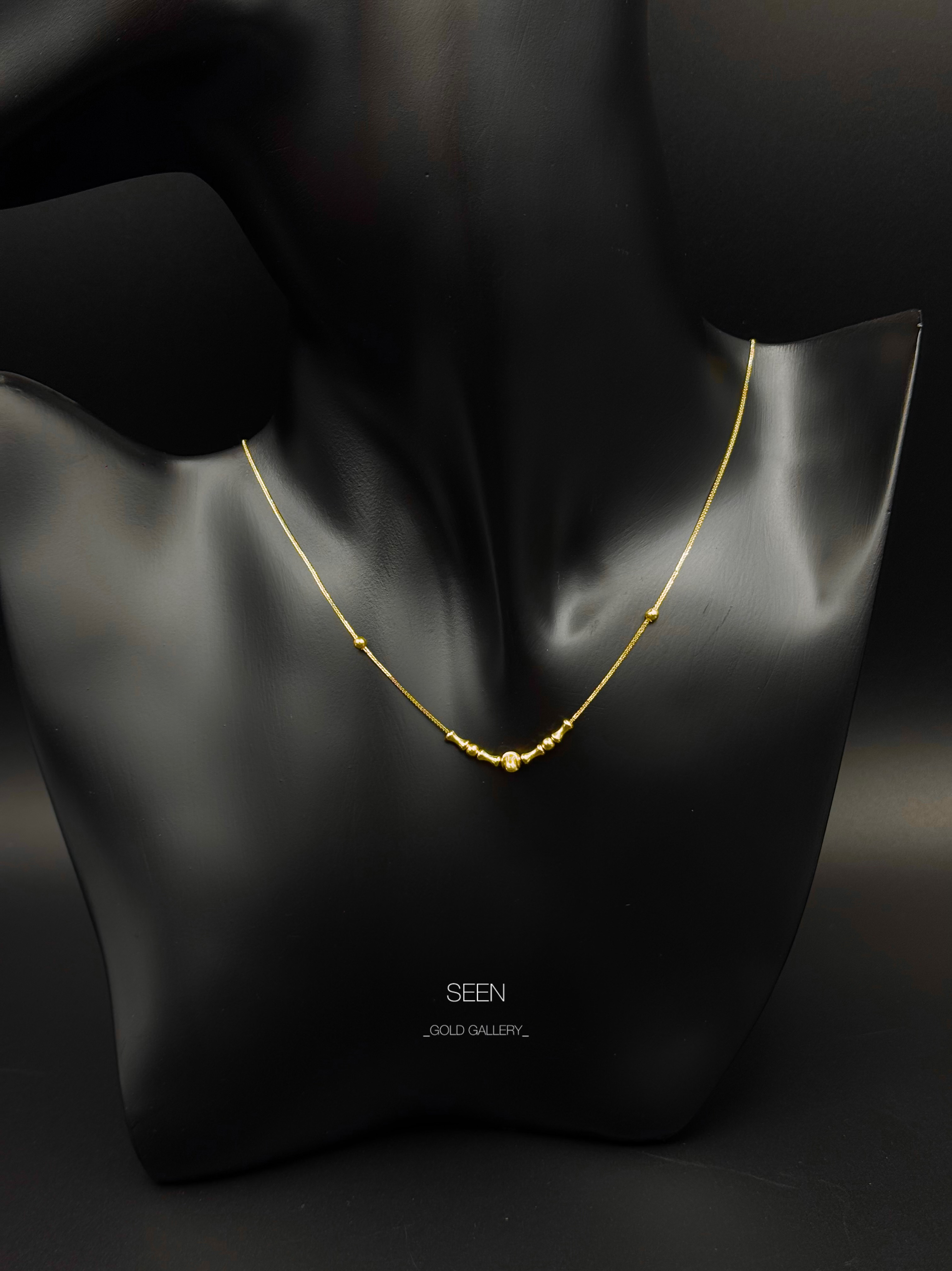 این گردنبند طلا مینیمال با ترکیب گویهای ظریف و المان استخوانیشکل، طراحی متفاوت و مدرنی را به نمایش میگذارد. توازن بین فرمهای ساده و کشیده، جلوهای شیک و امروزی ایجاد کرده که بهراحتی با استایلهای روزمره و مینیمال هماهنگ میشود.