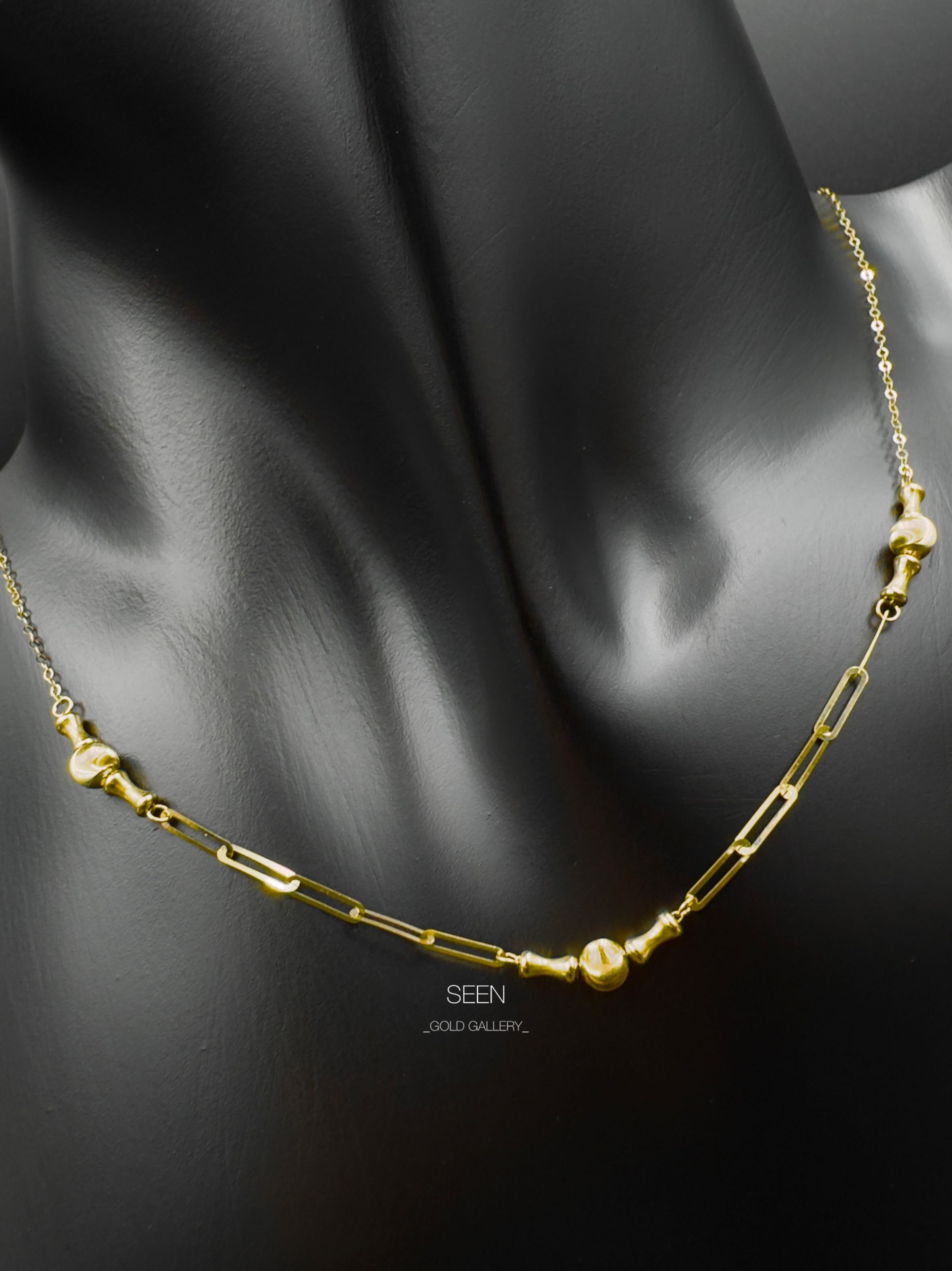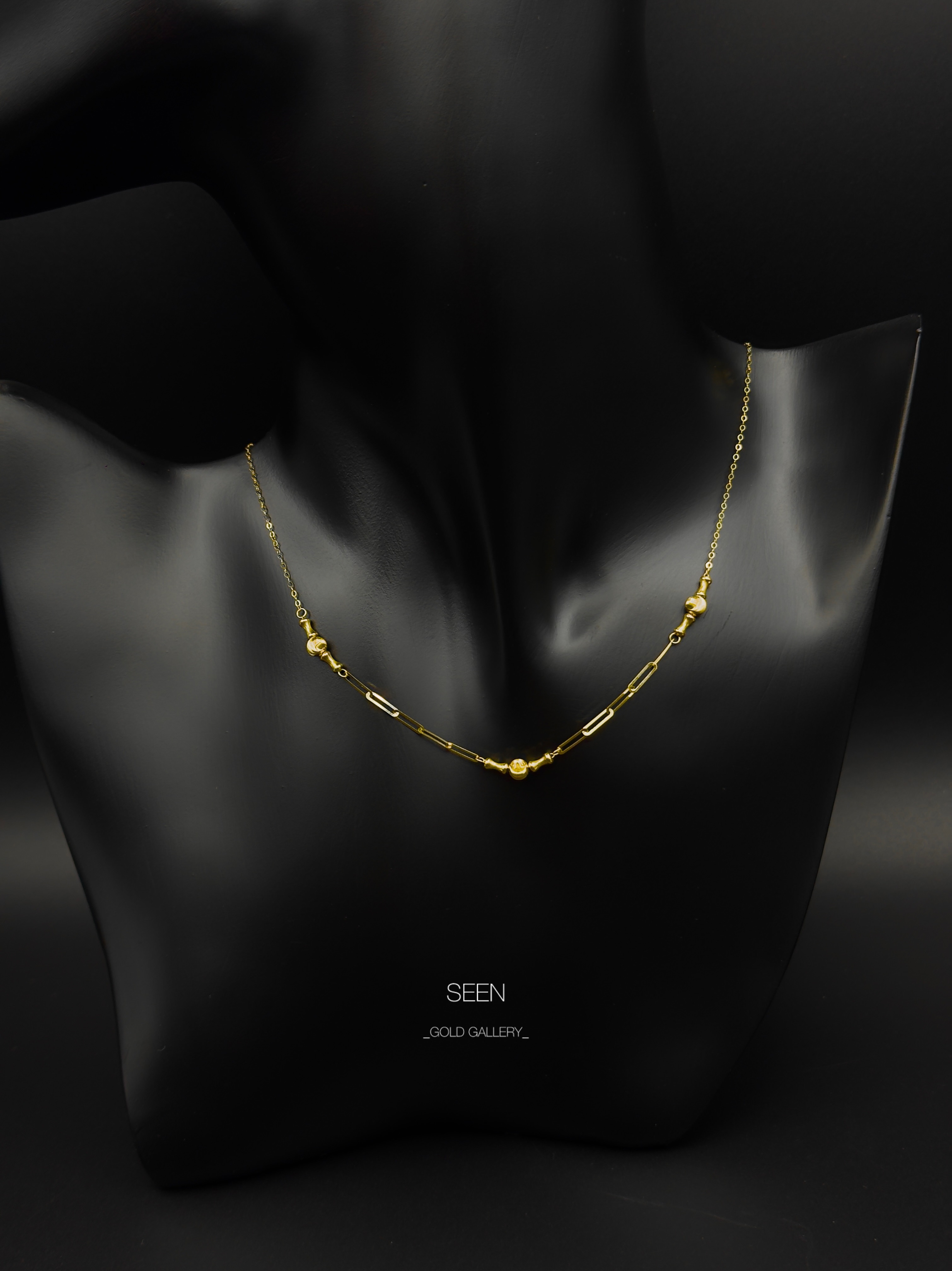 این گردنبند طلا مینیمال با ترکیب المان استخوانیشکل و هرمس، طراحی متفاوت و مدرنی را به نمایش میگذارد. توازن بین فرمهای ساده و کشیده، جلوهای شیک و امروزی ایجاد کرده که بهراحتی با استایلهای روزمره و مینیمال هماهنگ میشود.